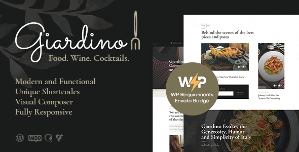 Giardino is an Italian Restaurant & Cafe WordPress Theme . It is fit for all kinds of food business, such as restaurant, cafe, sports pub, bakery, food portfolio and gallery, online shop, creative bar, pizza place, online reservation and menu, organic food, chef restaurant, football pub, buffet,snack bar, cafeteria, coffee bar, team room, tea shop bistro, brasserie, wine bar, cafe bar, cybercafe, anticafe, milk bar, diner, eatery, canteen, fast food and burger place, eating house, eater, eating place, lunchroom, fast-food place, grill, pizzeria, beer garden, cocktail lounger, drinkery, inn, alehouse, baroom, roadhouse, beer joint, saloon, taproom, happy hour establishment, tavern, public house, brewery, wineshop, whisky bar,