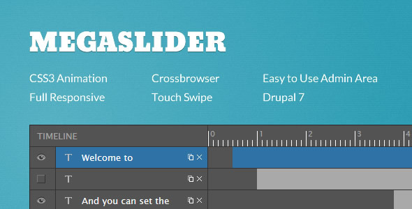MegaSlider is responsive slider module with touch-swipe navigation. You can add text, image or video to your slider. With a friendly admin user interface and power timeline manager, MegaSlider is highly customizable slider for Drupal 7.