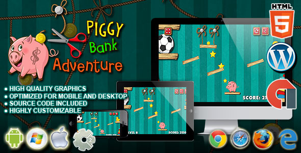 PiggyBank Adventure is a HTML5 Construct 2 Physic Game made up of 24 levels.