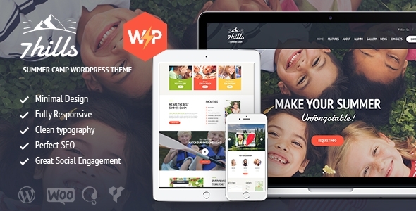 SevenHills is a modern Children Summer Camp WordPress theme with outstanding design. It suits Summer Camp or Outdoors Activities website. Furthermore, the theme includes 2 homepage layouts allowing you to give all the necessary information about your camp services, facilities, activities, events and programs. With SevenHills theme you can create photo & video galleries or schedule & plan events.