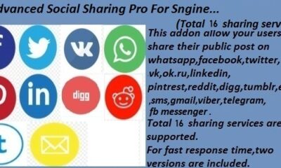add-ons/ 3 weeks agoAdvanced Social Sharing Pro For SngineAdvanced Social Sharing Pro is Addon For Sngine(v3.13&above).This addon allow your users to share their public post on whatsapp,sms,facebook,facebook messenger,twitter,gmail,vk,ok.ru,linkedin,pintrest,reddit,digg,tumblr,email,viber,telegram.Total 16...